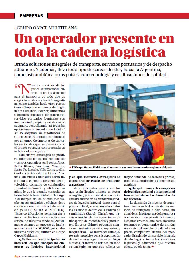 Participamos en la feria de ARGENTINA OIL & GAS 2015, que se realizó desde el 05 al 08 de Octubre en el predio ferial de La Rural. Esta feria contó con un área de exhibición de 112.000 mts2, destinada a mas de 300 empresas que han expuesto sus productos y servicios. Con una concurrencia de más de 20.000 personas, el evento ha sido un éxito. El grupo OAPCE – Multitrans, ha formado parte de la feria, con un stand propio de 13 m3; donde se permitió mostrar y dar a conocer todos los servicios que cada una de las unidades de negocio brinda. En este sentido el grupo conformado por las empresas OAPCE Transportes Internacionales, Multitrans S.A. y Puerto Villa Constitución, logro mostrarse como un Operador Integral de Comercio Exterior; También se permitió presentar la nueva unidad de negocios del Grupo, OAPCE Chile SPA. Esta última abocada a brindar los servicios de Logística Terrestres Nacional e Internacional dentro del territorio Chileno. Para el grupo esta feria ha sido muy enriquecedora ya que permitió mostrar su estructura y servicios abocados también a la industria Petrolera y Petroquímica.
